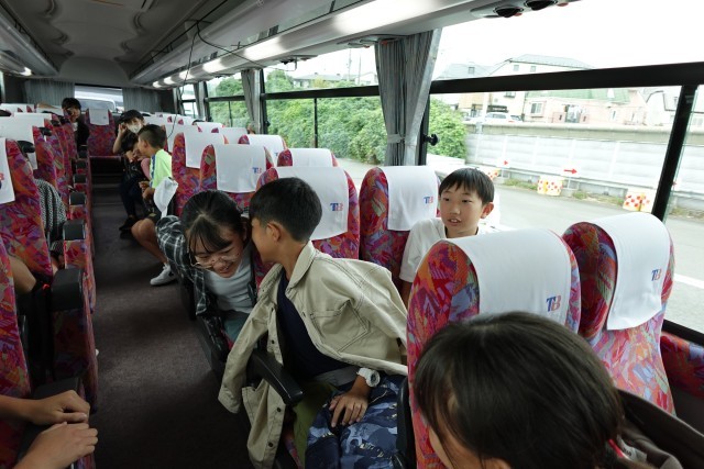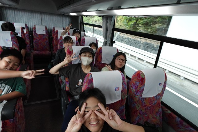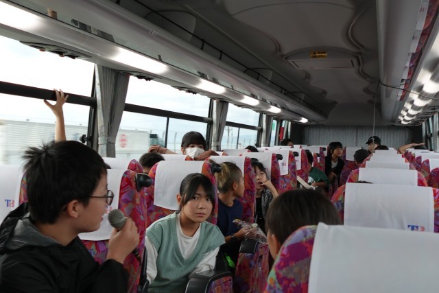 朝早い出発でしたが元気よく「いってきます!」とお見送りの先生に伝え、学校を出発しました。バスの中ではレク係中心にバスレクを行っています。