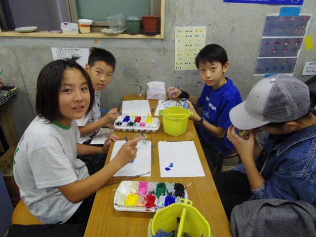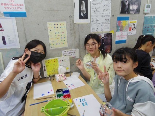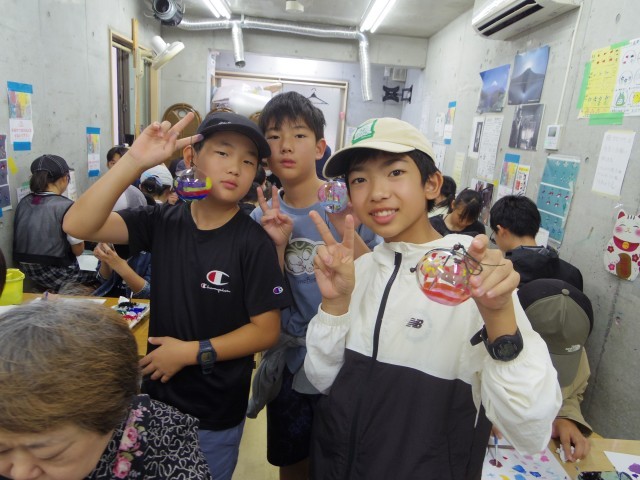 風鈴チームです。江戸風鈴に絵付けをします。内側から書くのが難しい…みんな思い思いに絵をかきました!