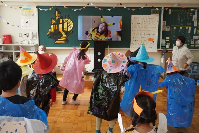 今日はハロウィン・パーティーです。はやぶさの子供たちがコスチュームを着て踊ったり、ファッションショーをしたりして楽しんでいます。
