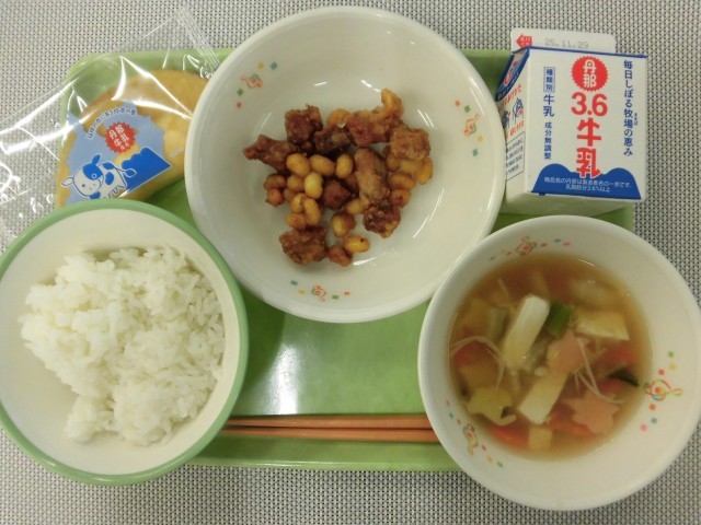 今日は、11月24日の和食の日にあわせて、和食の日のこんだてでした。だしのきいたすまし汁はいかがだったでしょうか。和食の日についてのおたよりを配布しますので、ご家庭でもぜひ話題にしてみてください。ごはんは、するがのきわみの新米を味わいました。いつものごはんと味の違いがあったかな?