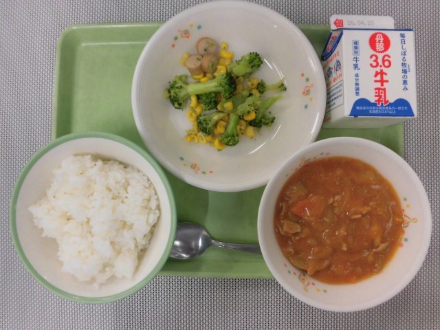 (4月13日) ごはん ハヤシライスソース ぎゅうにゅう ブロッコリーのソテー