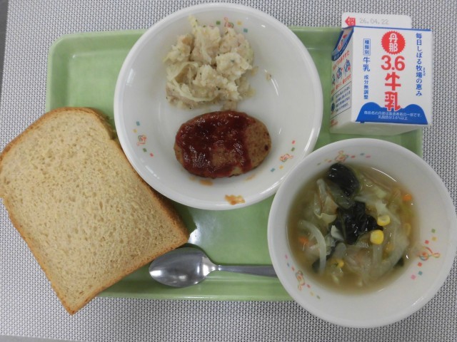 (4月14日) 黒糖入り山型食パン ぎゅうにゅう ハンバーグ ツナポテト キャベツスープ