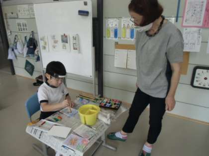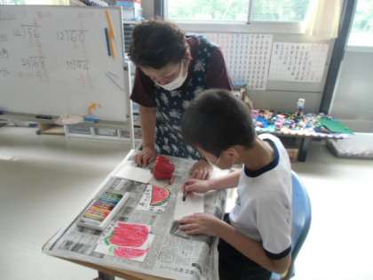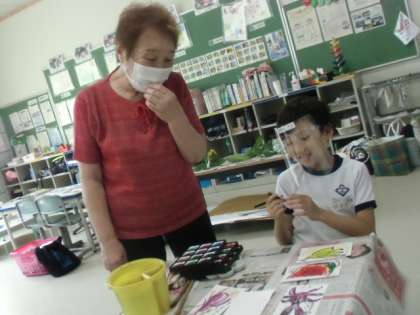はやぶさ1組さんが、「富っ子スクール」のボランティアさんに、絵手紙を教えてもらいました。花火やカブトムシ、パプリカやスイカ…。夢中で描いていました。