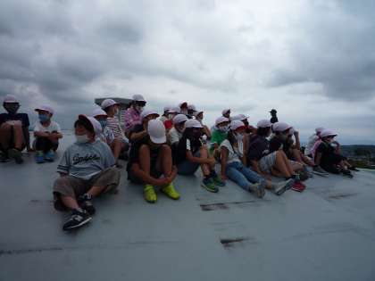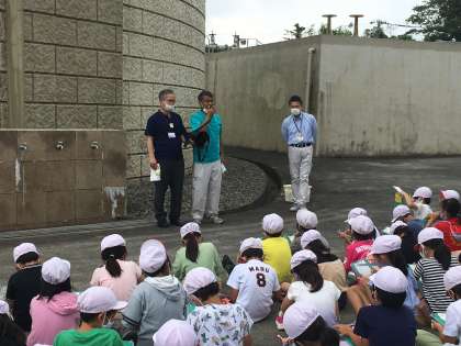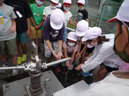 見学の最後は、裾野市で一番大きい配水場に来ました。特別に貯水タンクの上に登らせてもらったり、井戸の水をくみ上げたりと貴重な体験ができました。