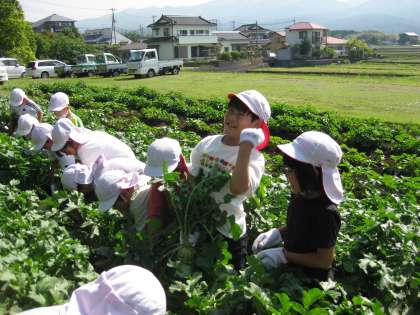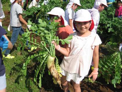 富っ子スクールの一環で地域の人が育ててくださった春大根を収穫させていただきました。どの大根も立派に育っていて、子供たちは楽しく収穫することができました。