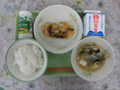 【ごはん・牛乳・鮭のチーズ焼き・じゃがいもと玉ねぎのみそ汁・のむヨーグルト】