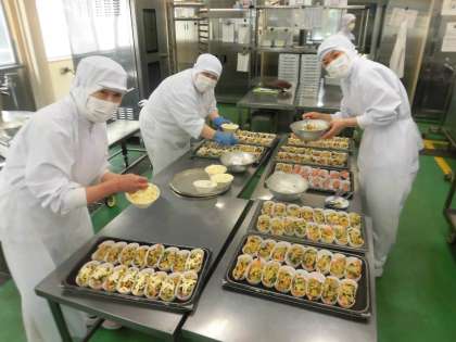 今日の給食は「すその頂飯(いただきめし)」です。裾野市では、富士山の麓の地形を活かした準高地トレーニングをするスポーツ選手を応援しています。食べるのも練習の一つと言われているほど、スポーツで良い結果を出すためにはバランスの良い食事は欠かせません。すその頂飯は、そんなスポーツ選手の食事をサポートするために開発されたメニューです。