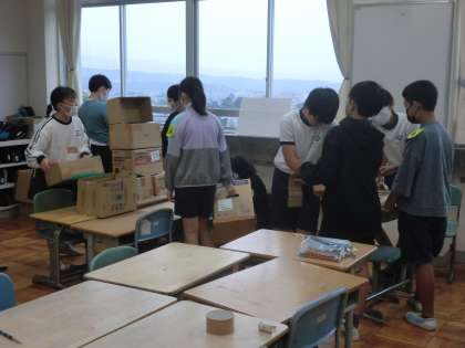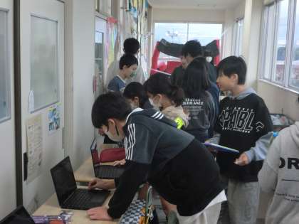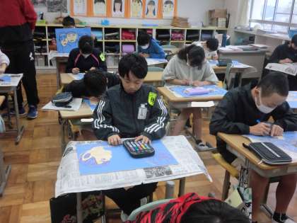 6年生の授業の様子です。明日の富っ子のつどいに向けて、最終の準備を行っていました。図工では、集中して版画を掘り進めました。