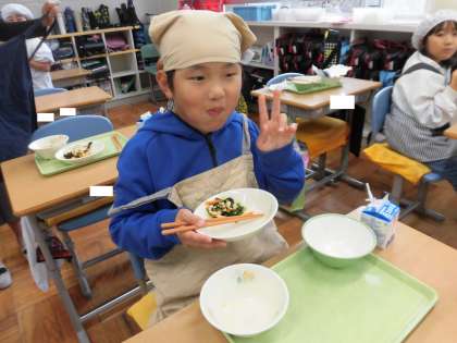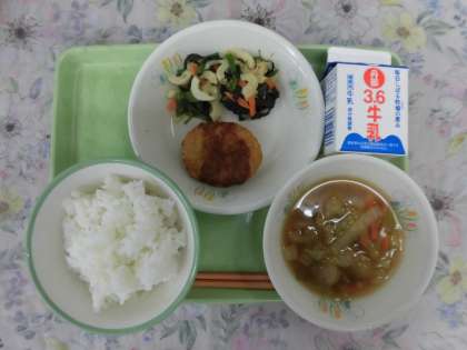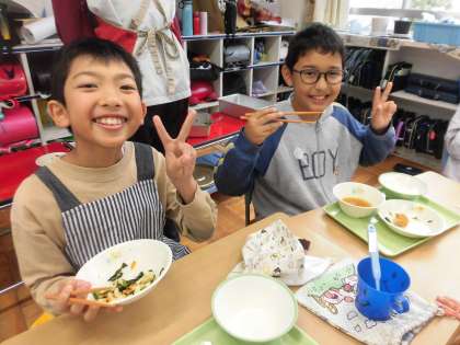 そして、野菜たっぷりの「とり団子汁」、「ちくわとほうれん草の炒め物」は明日の富っ子のつどいのために!と野菜が苦手な子も一生懸命食べていました。朝ごはんもしっかり食べて、元気に富っ子のつどいを盛り上げたいですね!(^^)!