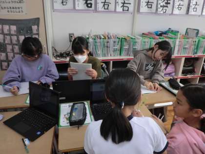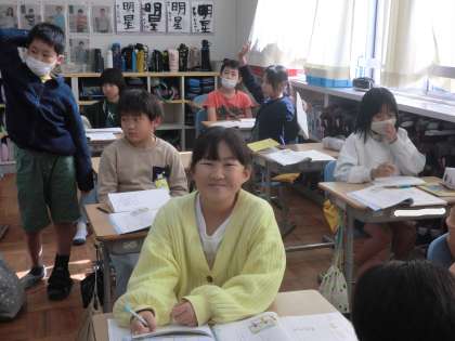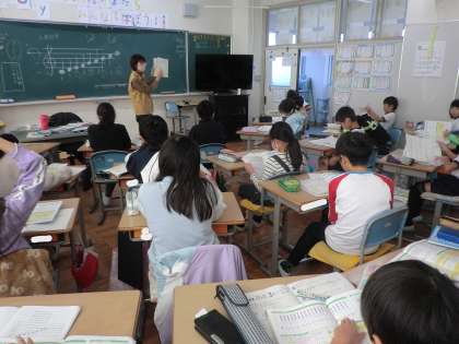4年生の「算数」「国語」「音楽」の授業の様子です。算数では、友達と教え合いながら、問題に取り組み、理解を深めていました。