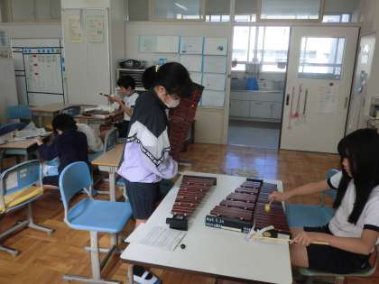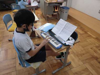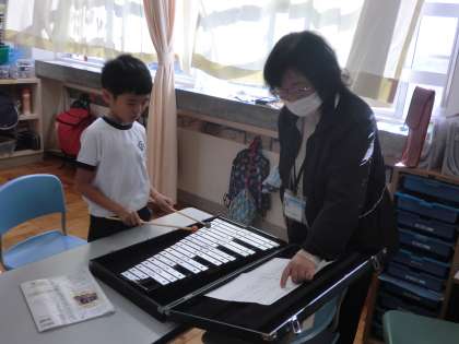 はやぶさ学級、音楽の授業風景です。今日は、それぞれが、木琴、鉄琴、鍵盤ハーモニカなどの楽器の練習に励みました。