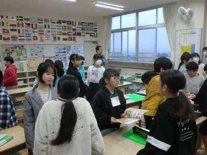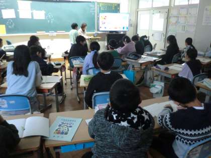 4年生の授業の様子です。社会では、リサイクルのマークに視点を当て意見交換を行いました。外国語活動では、ALTと一緒に友達とのコミュニケーションを楽しみました。
