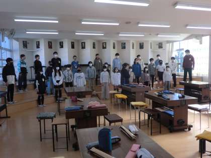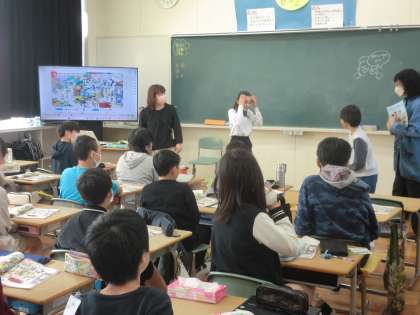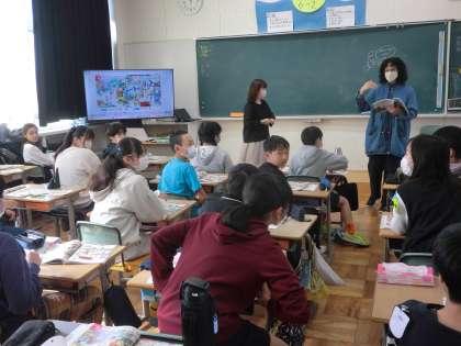 6年生の「音楽」「外国語」の授業風景です。「外国語」では、ジェスターを使った英語のクイズを楽しみました。