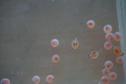 ニジマスの卵にも変化が見えました。しっぽのような体らしきものが見えます。寒さに負けずに頑張っています。