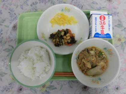 【ごはん・牛乳・さといものそぼろ煮・五目煮豆・たくあん】