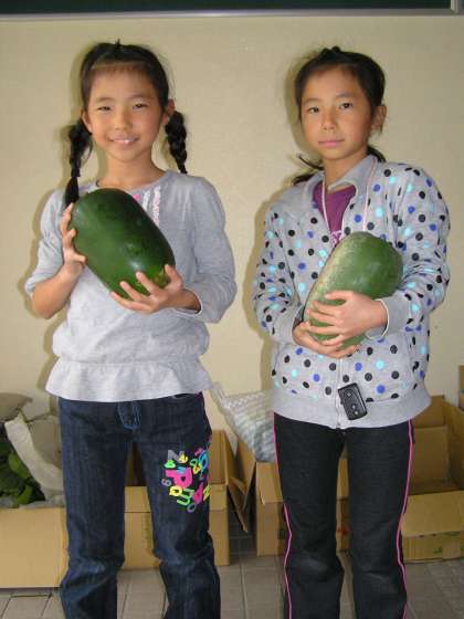 放課後にもどんどん野菜を届けてくださる方がいらっしゃいました。どんな献立に変身するか楽しみです。25種類くらいの野菜が集まってきています。
