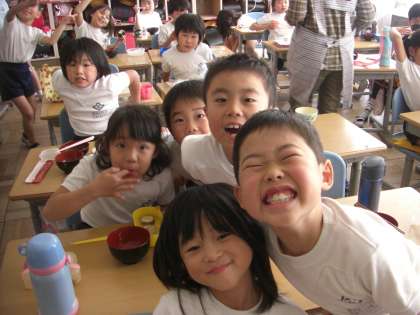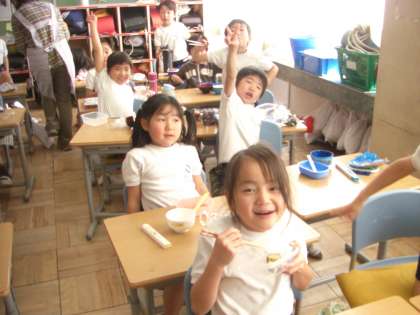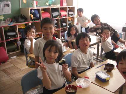 先生方が作ったサツマイモの味噌汁と一緒に「いただきます。」