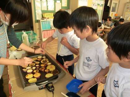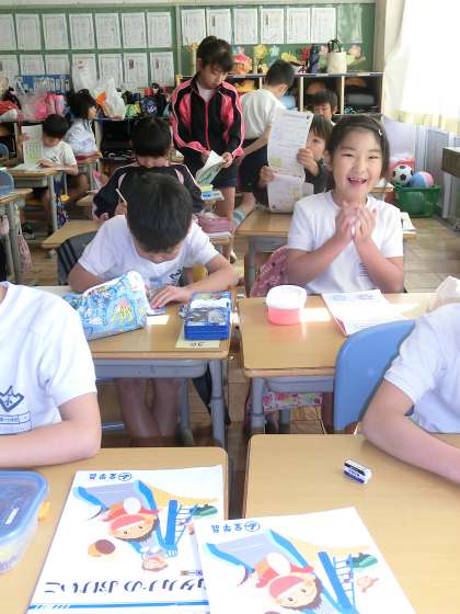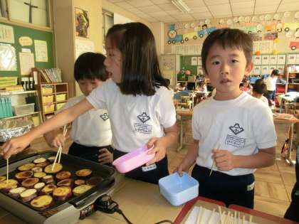 いいにおいが2階まで届きます。待っている子は、カタカナの練習をやっています。