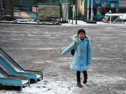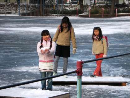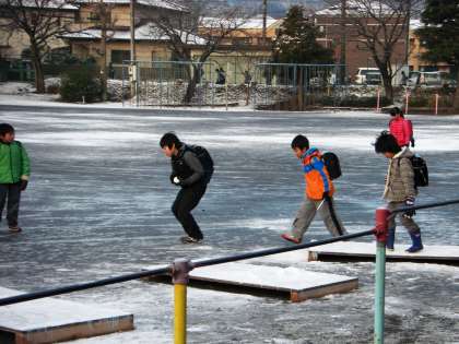 運動場が凍って、スケートリンクのようです。朝は、体育館で運動することとしました。