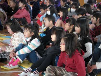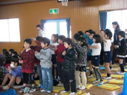 2年生が明日の6年生を送る会のリハーサルをしています。漫才のようなかけあいをお楽しみに。