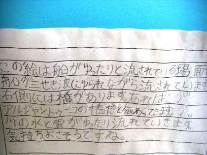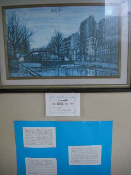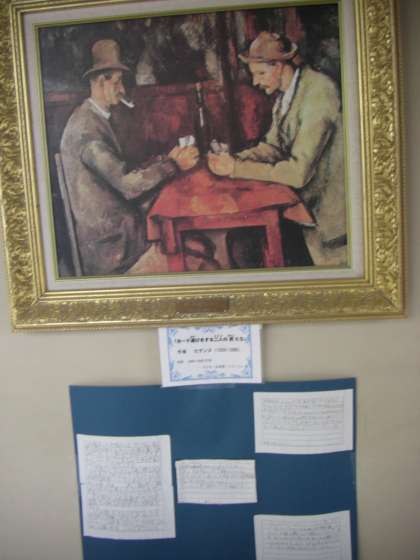 渡り廊下に飾ってある絵画の下に、作品紹介が増えました。4年生がみんなで