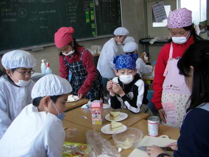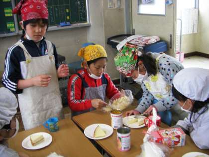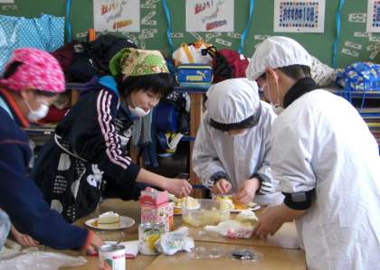 フルーツは白桃とみかん。チョコでデコレーションをして、できあがり。
