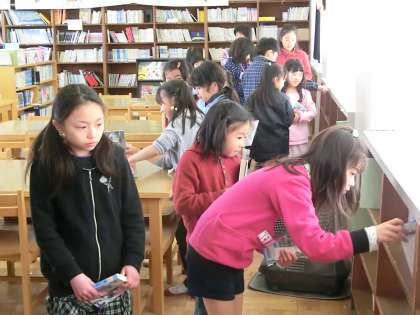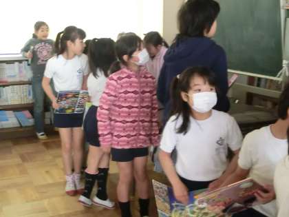 特別日課明けで、図書室に本を返却する子が続々と集まってきて、列ができました。貸し出しは、今週金曜日までです。