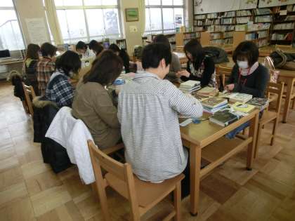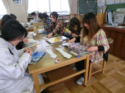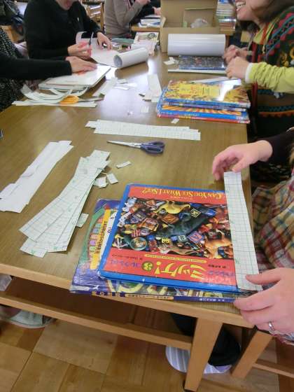 今年度最後の図書ボランティア活動の様子です。子供たちが気持ちよく本が読めるように本の修理をしてくださっていました。