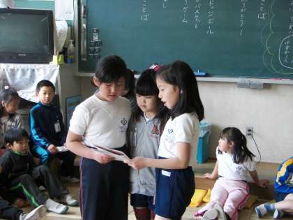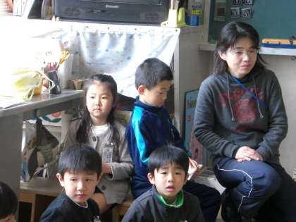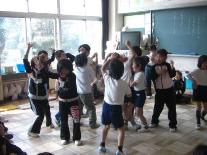輪になって、ハンカチおとしや何でもバスケットをしています。