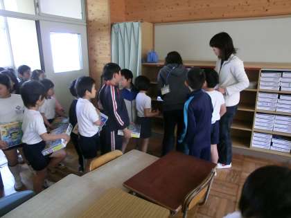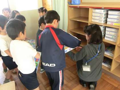 1年生が、2年生のプレイルームに荷物を運び込んでいました。