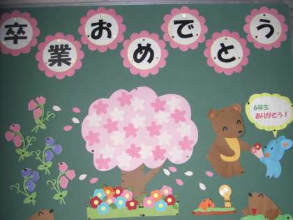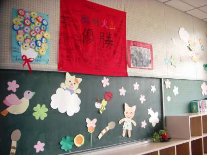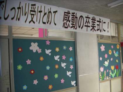 6年生の教室を、5年生がきれいに飾りつけをしてくれました。午後の開式を待っています。