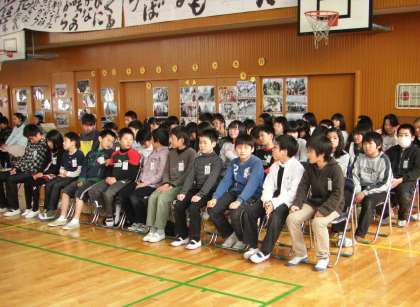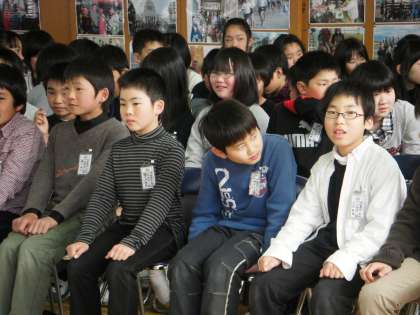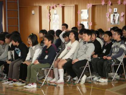 5年生が卒業式の始まりを待っています。少し緊張した面持ちです。