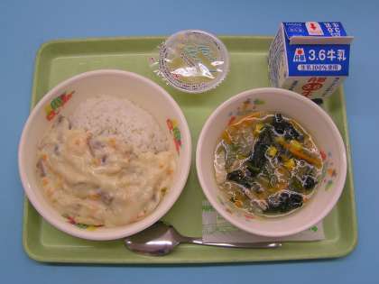 今日のエビクリームライスは、夏休みにテレビで放送されて、「とてもおいしそうだったから、給食で作ってください!」という小宮山まさこ先生のリクエストにお答えしました。