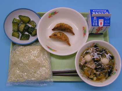 中華めん・牛乳・しょうゆラーメンスープ・揚げぎょうざ・きゅうりのピリ辛じょうゆ