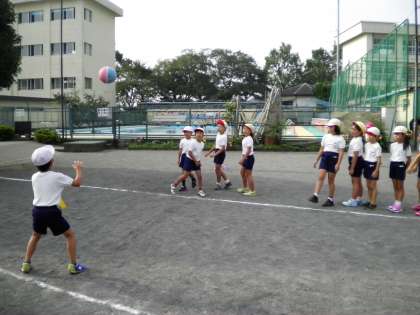 2年生はドッジボールラリーをしています。
