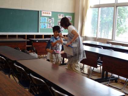 今日は1年生の視力検査です。順番を静かに待っています。持ち方を教わったあと上手に指差しで答えていました。今、富一小では「目を大切にしよう週間」も実施中です。