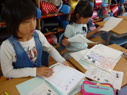 定規を使って線を引き、自分で完成させた紙ファイル。いよいよ初めてのとじこみ作業です。校外学習の資料なので、とじこむ順番を慎重に確かめていました。