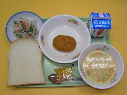 山型食パン・リンゴジャム・牛乳・牛肉コロッケ・ごぼうサラダ・コーンスープ
