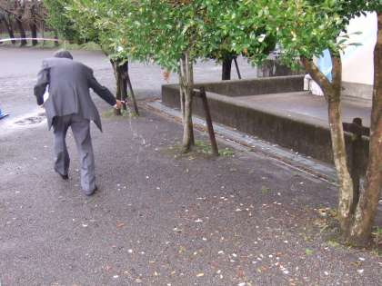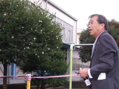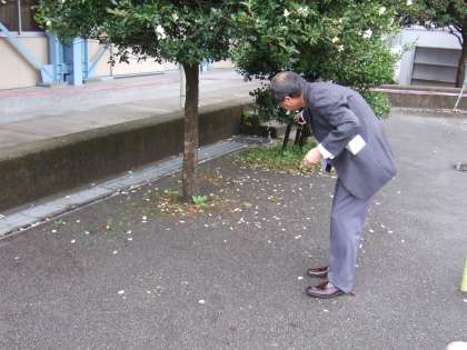 ハチが集まってくる木を切ることにしました。ここまで立派に育ってきた木ですが、子どもたちの安全を第一に考え、断腸の思いで決断しました。せめてものお詫びと今まで甘い花の香を楽しませてくれたお礼を込めて、校長先生が祝詞をあげ、御神酒とお塩で木の生霊に伐採の許しを請いました。