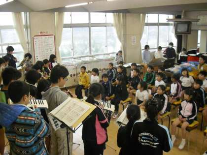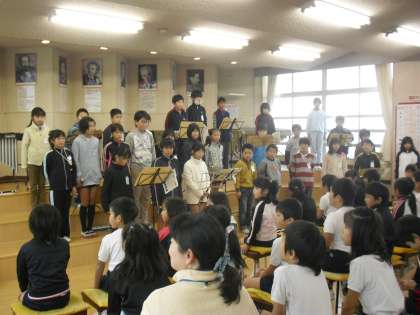 5年生が、2年生を招いてミニミニコンサートを実施しました。この企画は、来年からリコーダー練習をはじめる現2年生に、リコーダーの音色を聞いてもらい、関心や意欲を高めてもらうことを目的に行われたものです。