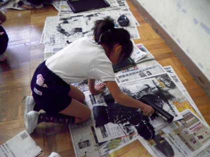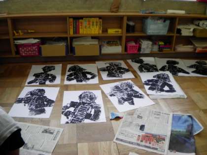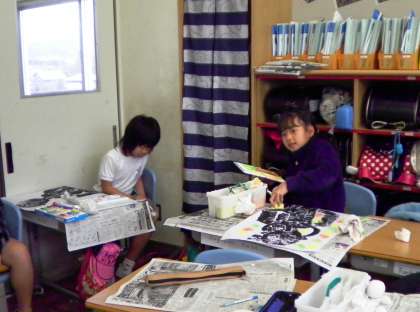 3年生が、できあがった版画に色をつけています。