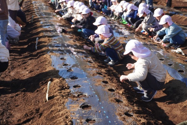 1年生はジャガイモの種芋を植えました。子供たちは等間隔にじゃがいもを置いていきま...