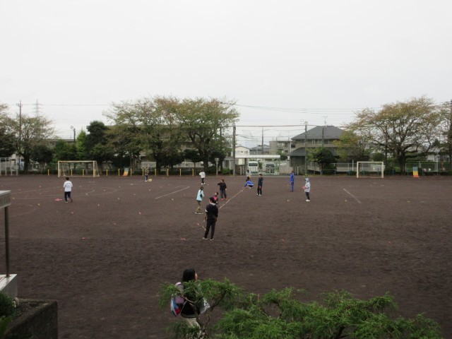 放課後は、当日に向けて職員が運動場に目印を付けました。
