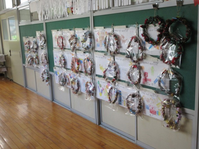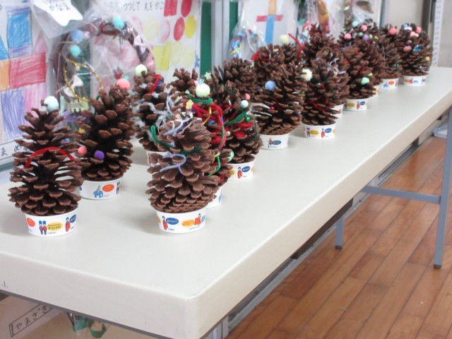 松ぼっくりのクリスマスツリー、さつまいもやアサガオのつるを使ったリースなど、作品が廊下に並んでいます。