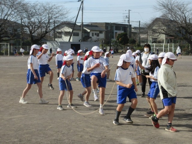 体育の時間に長縄跳び(8の字跳び)に取り組む3年生。
