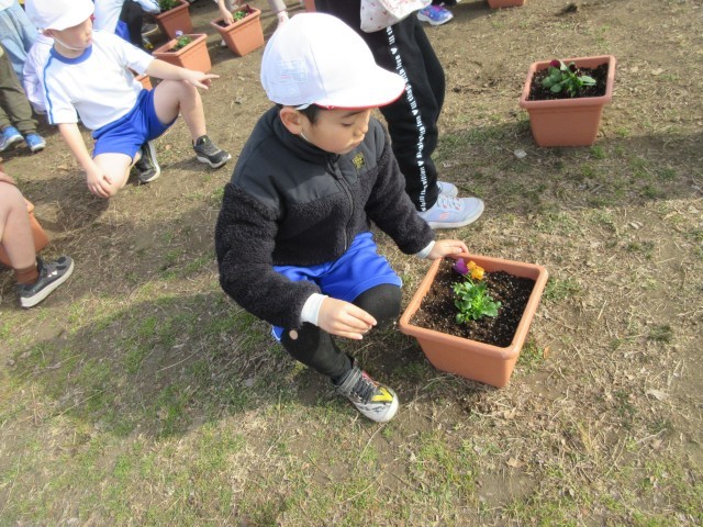 2年生が、パンジーの苗を鉢に移し替える活動を行っていました。
