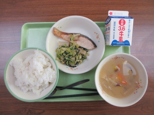・ごはん ・牛乳 ・塩鮭 ・小松菜のごま炒め ・サツマイモの味噌汁