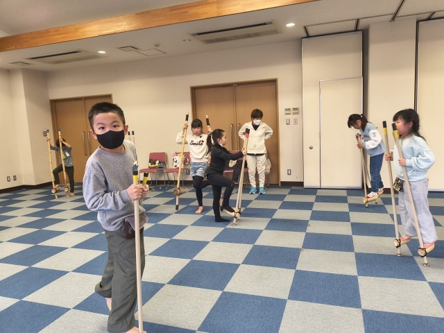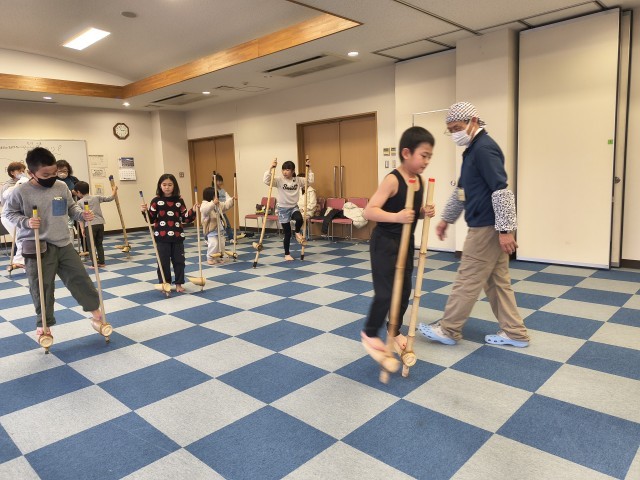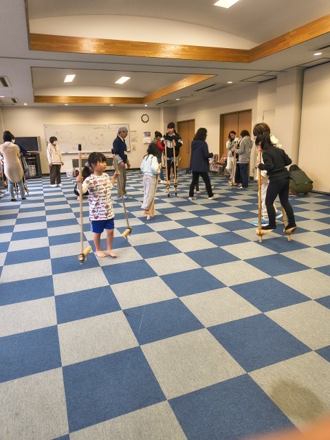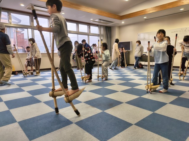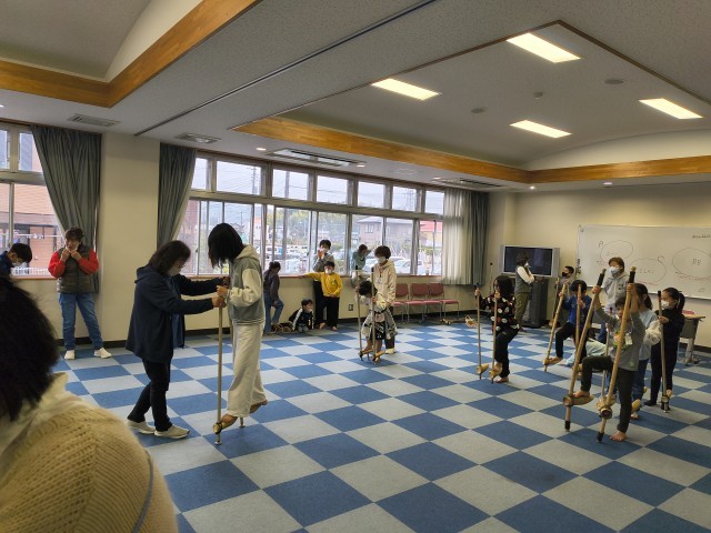 地域の方が作ってくれた竹馬や、竹ぽっくりにチャレンジしました。地域の方々も、子どもたちの見守りに来てくれました。始めは乗ることが出来なかった子も、地域の方に支えてもらいながら一歩一歩、最後は1人で乗れる様になった子がたくさんいました。汗をかきシャツになる子も。みんな夢中で遊んでいました。またやろうよ!そんな声がとてもうれしかったです。