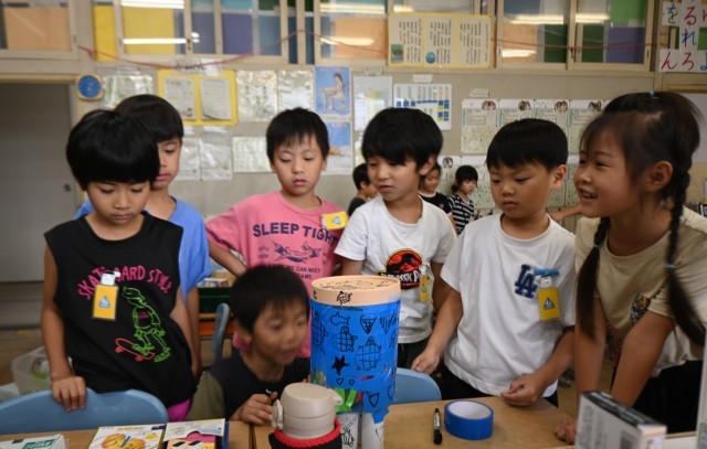 図工では、箱を使って積み上げたり、並べたりしながら作品をつくりました。