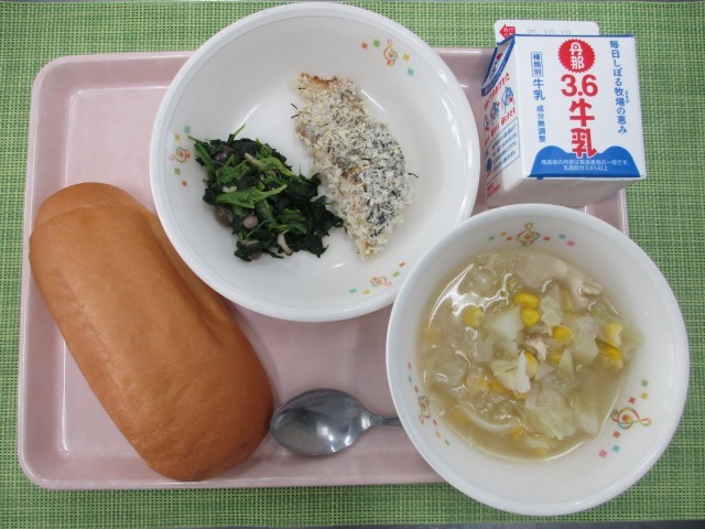 ☆こんだて☆ マーガリンロールパン 牛乳 魚のお茶パン粉焼き しめじとほうれん草のソテー キャベツとコーンのスープ